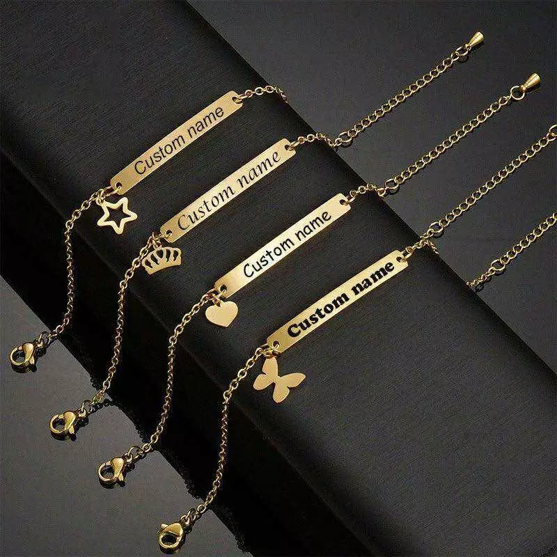 Offrez un bijou unique et intemporel grâce à notre bracelet personnalisable en acier inoxydable doré. Son design élégant s’accompagne d’un pendentif au choix (étoile, couronne, cœur ou papillon) et d’une plaque où votre nom, prénom ou mot spécial peut être gravé.