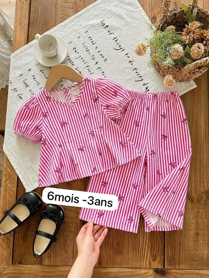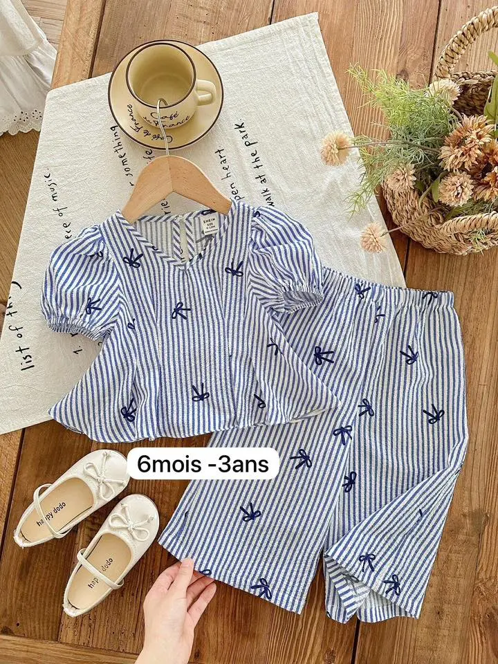 Craquez pour cet adorable ensemble bébé fille au style doux et élégant 💙Composé d’une blouse rayée bleu ciel avec jolis petits nœuds décoratifs à l’avant et d’un short assorti confortable, il est parfait pour les journées chaudes, les sorties ou les ...