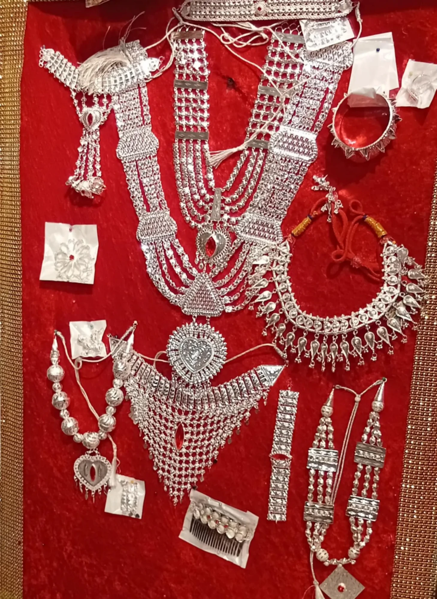 Cette parure raffinée comprend plusieurs colliers, boucles d’oreilles, bracelets et ornements de tête, finement travaillés à la main avec un style inspiré des bijoux orientaux et berbères.