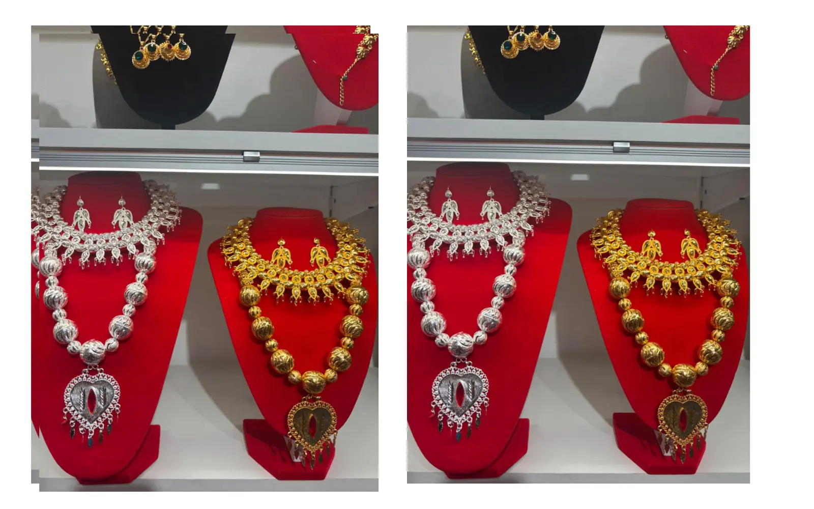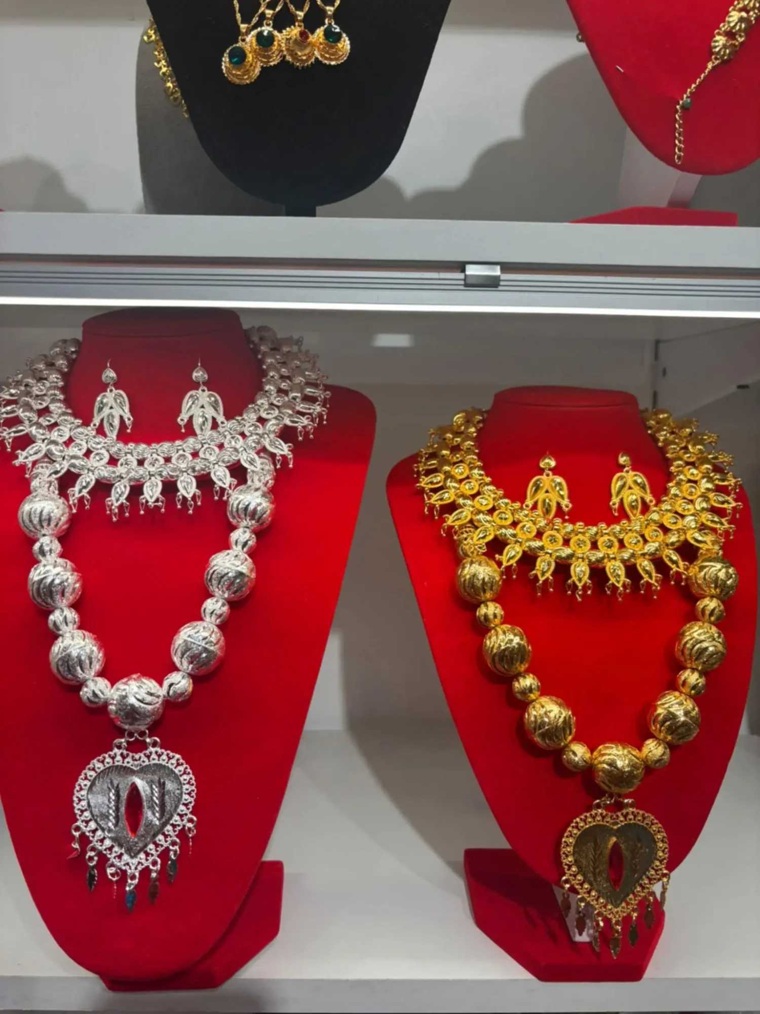 Chaque parure comprend un collier imposant, des boucles d’oreilles assorties et des détails ciselés à la main, inspirés de la tradition locale. Ces bijoux, à la fois majestueux et symboliques, sont parfaits pour sublimer les tenues traditionnelles comme le Shilya ou le boubou comorien.